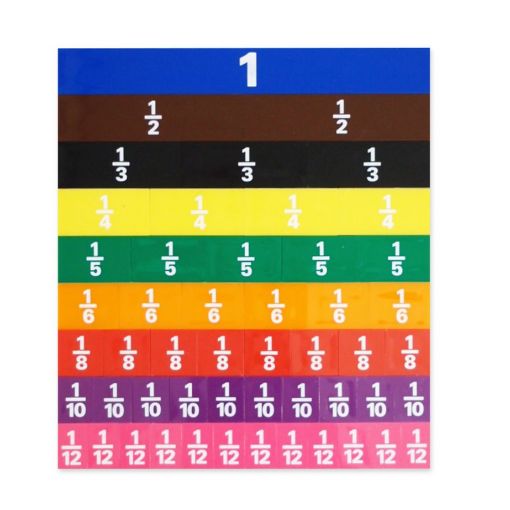 Age 7+ Using these fraction tiles, children obtain a visual understanding of equal parts, fractions and equivalent fractions, e.g seeing that two quarters are together the same as one half.