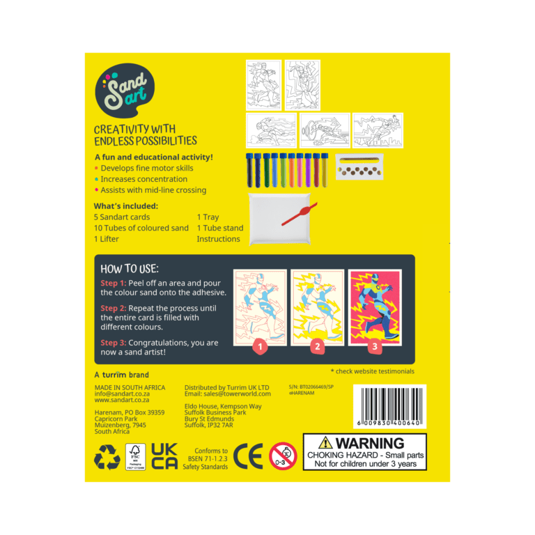 The Super Hero Neon Range is bright, colourful & playful! With all-new postcard designs and non-toxic neon sand, your kids will have hours of fun! Children love colour, so this is the perfect way to entertain them.